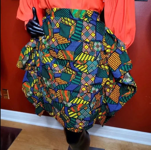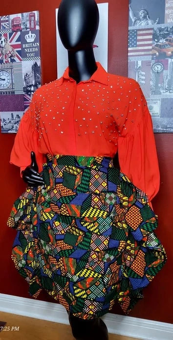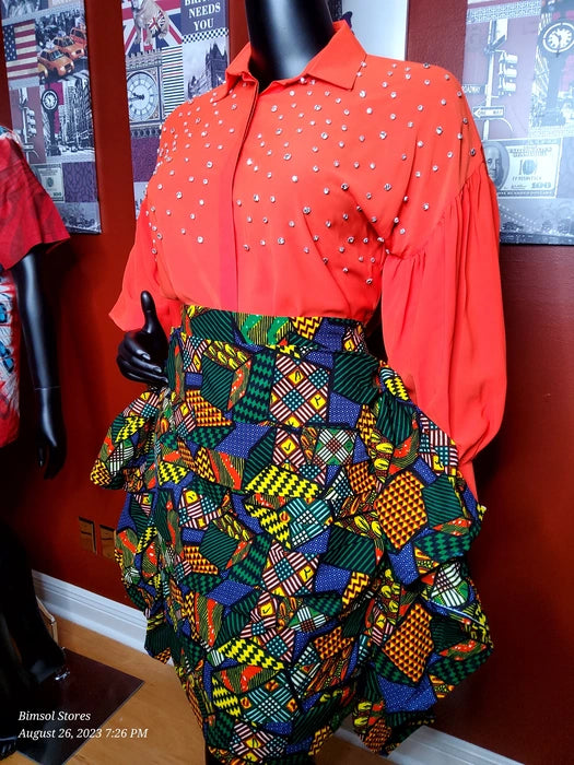 Step out in style with the Ajoke-Ade Ankara Skirt. Crafted from a vibrant Ankara fabric, this exclusive piece will bring a touch of luxury to any look. Its sleek, fitted design will enhance your curves, while the unique pattern helps you stand out from the crowd. Make a statement with this fashion-forward piece.