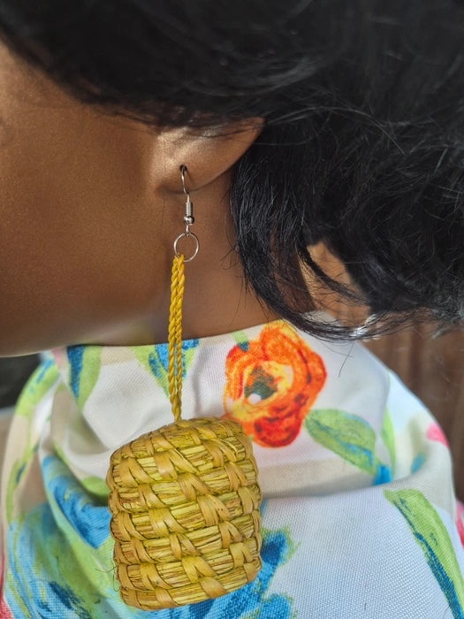 Add a splash of vibrant culture to your look with these playful raffia basket earrings. Handmade in Nigeria, each dangle earring showcases unique craftsmanship and natural texture, making them the perfect statement accessory to brighten any outfit. Lightweight and lively, they bring fun and flair wherever you go.